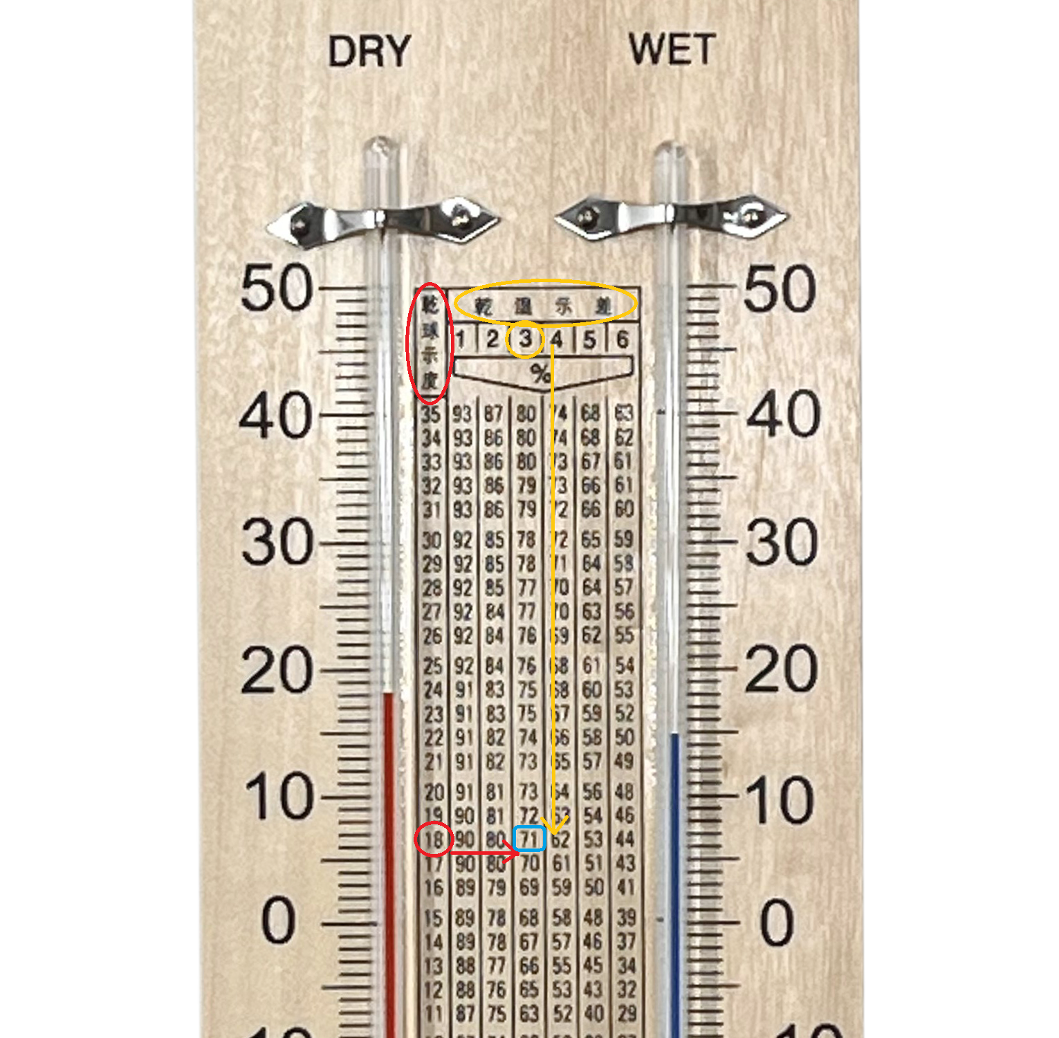 2.乾湿計本体に印刷されている換算表で