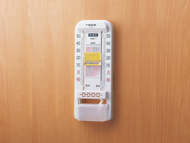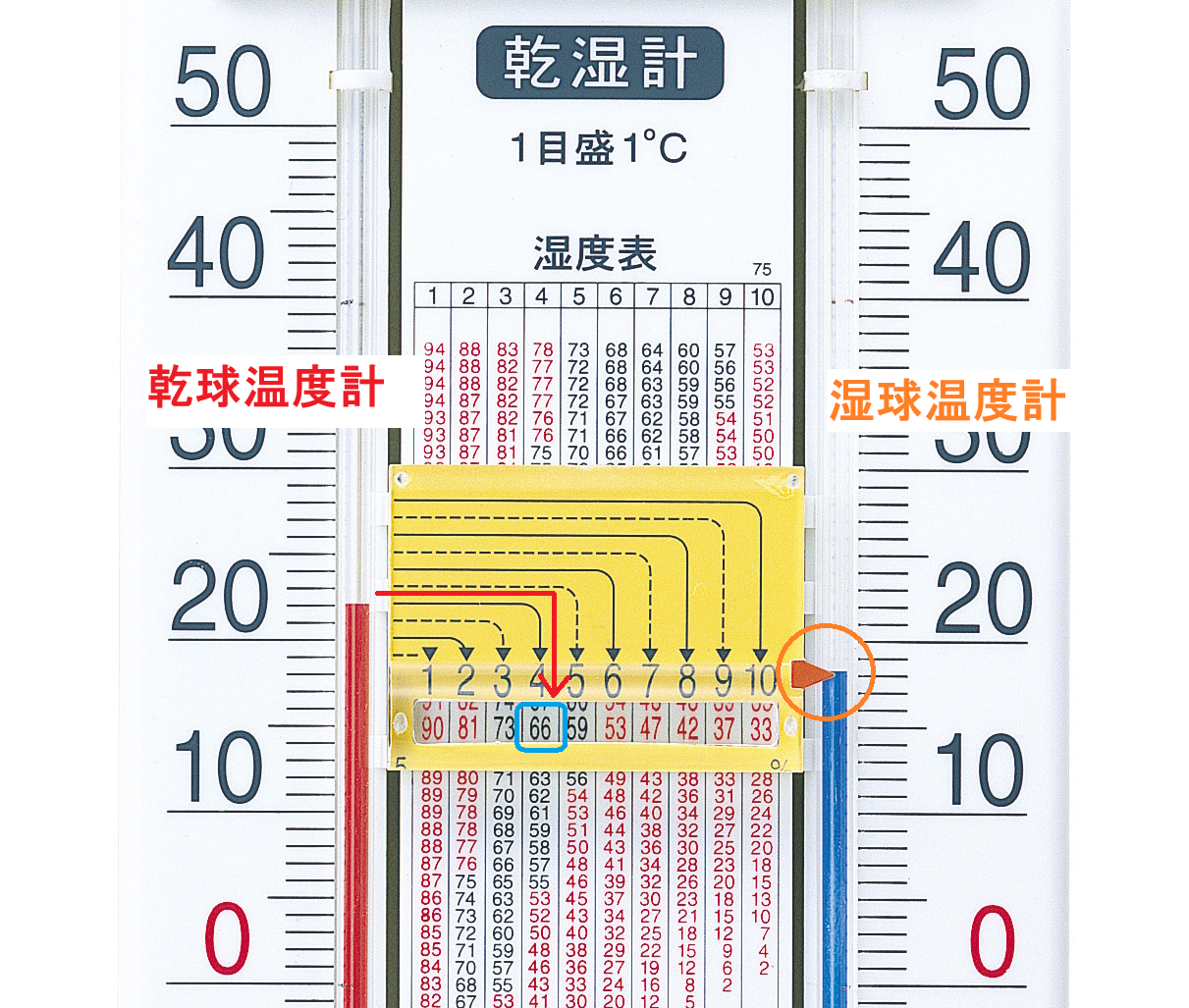 乾球温度計で気温、乾球温度計と湿球温度計の温度差から湿度(相対湿度)を測定します。