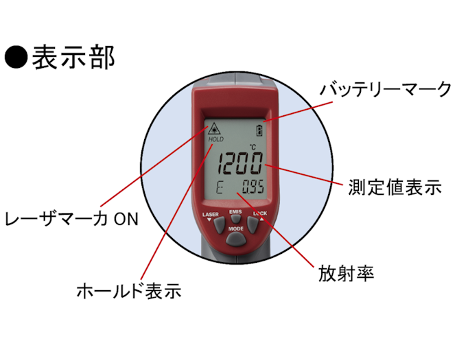 ±2℃または±2% readingの大きい方:0℃以上 ±(2℃+5% reading):0℃未満 (条件)測定環境温度23±3℃、放射率0.95にて | |