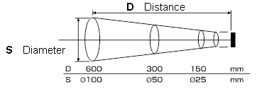 The measurement spot size of this thermometer changes in accordance with the distance as shown above. This spot is defined on the basis of the area that receives 90% or more of the energy. The D:S ratio, which is the ratio of the distance between the object and the thermometer to the size of the spot, is preset at 6:1 (D = measuring distance, S = diameter of spot). For example, for the distance of 150 mm, a spot circle of diameter 25 mm can be measured.