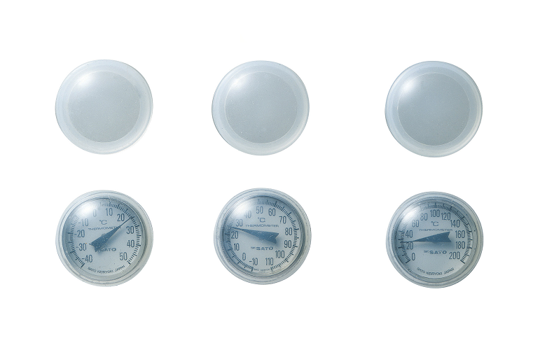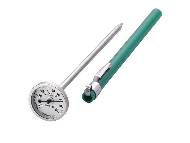 A portable dial thermometer useful for spot check, with a dial cover and a sheath with a clip attached: Choose your preferred one from three temperature ranges. This model is of −40 to 50°C.