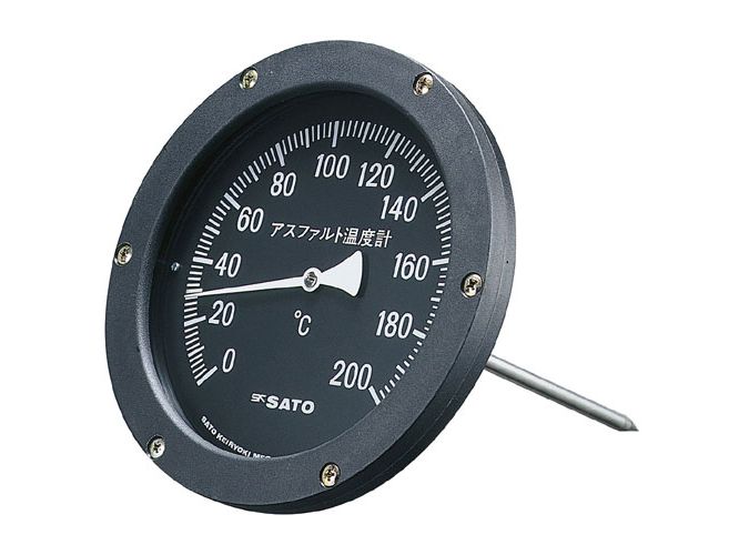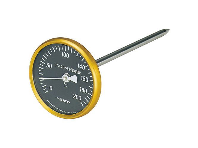 A 175-mm diameter dial thermometer to insert its sensing stem to asphalt.